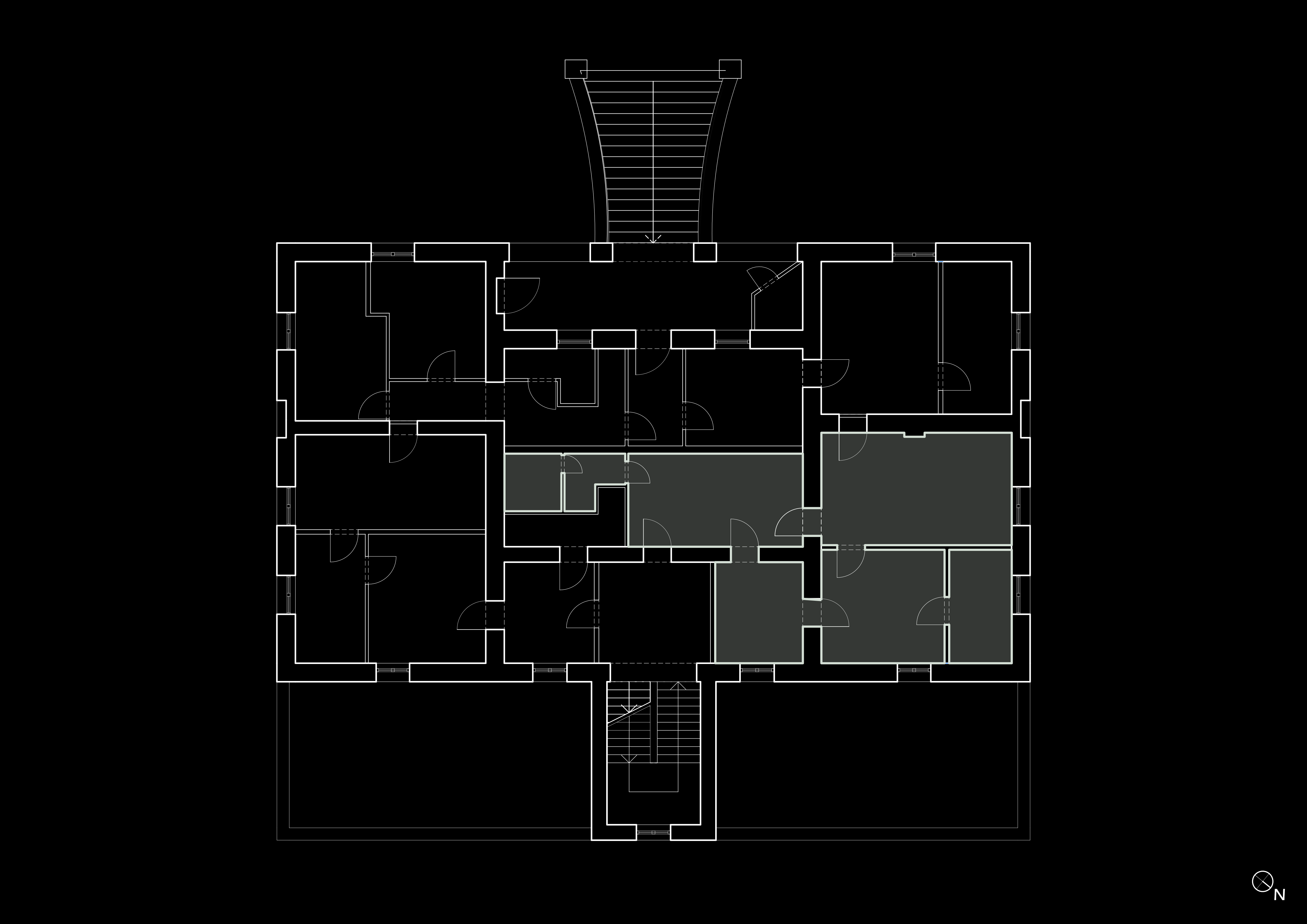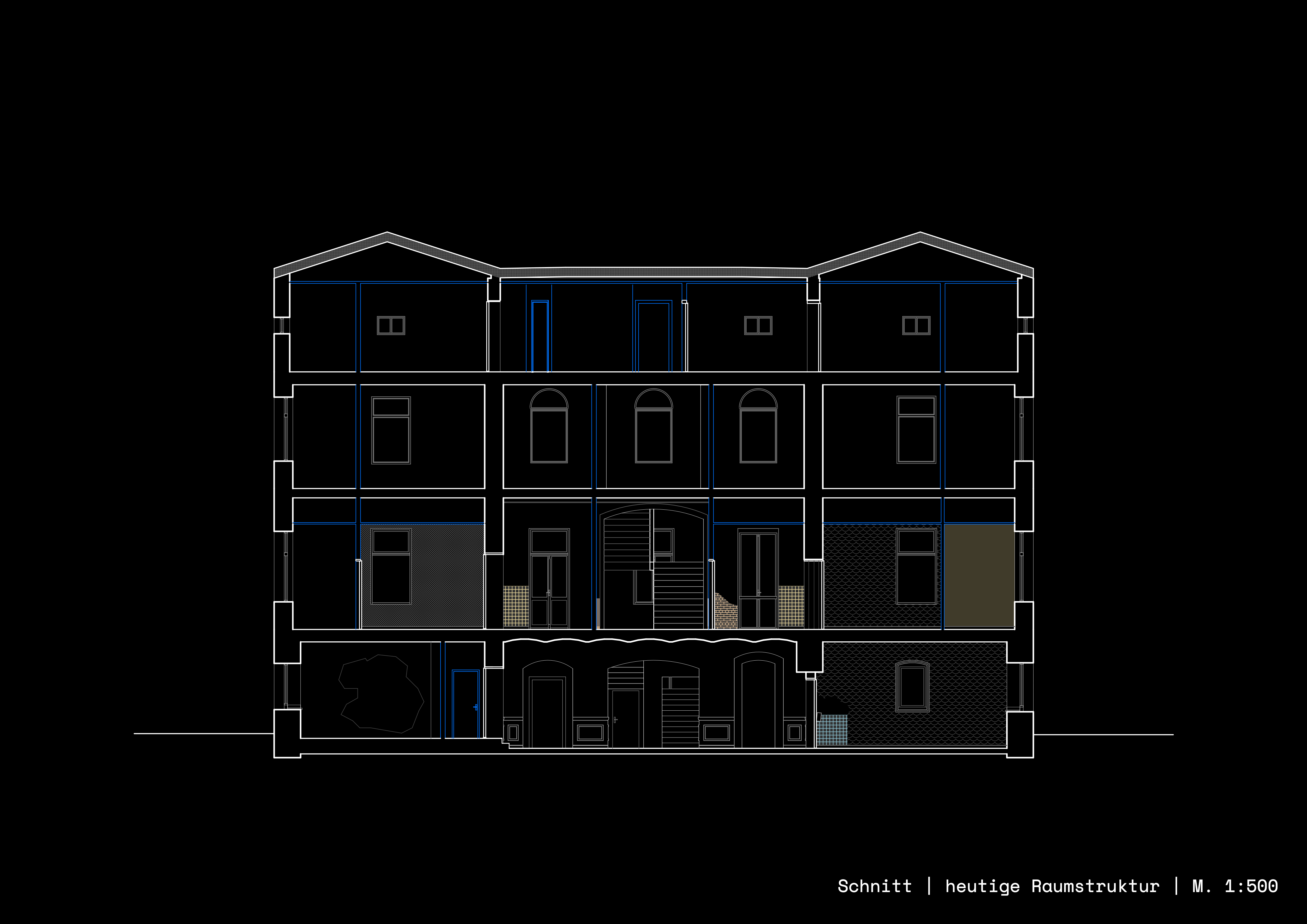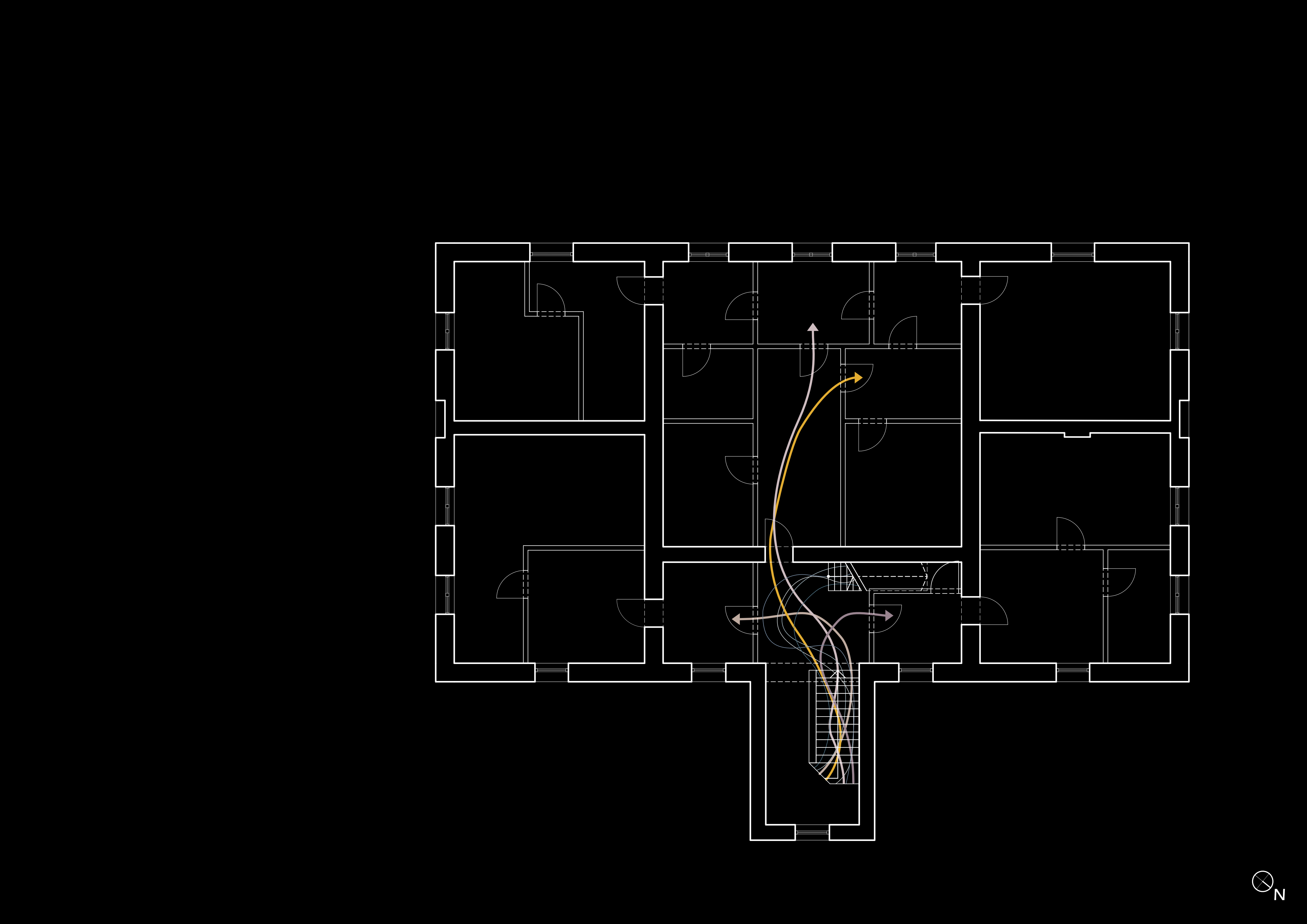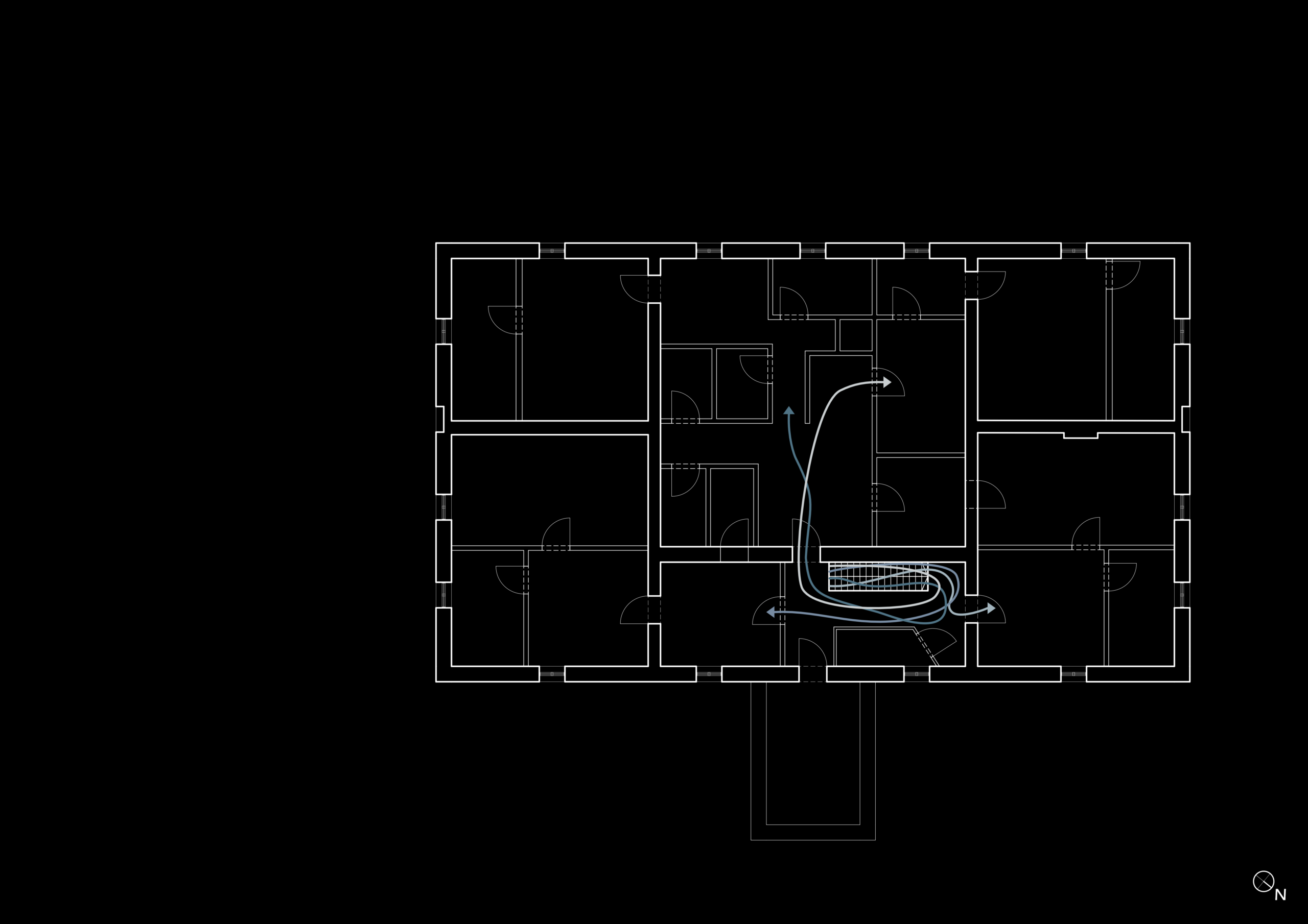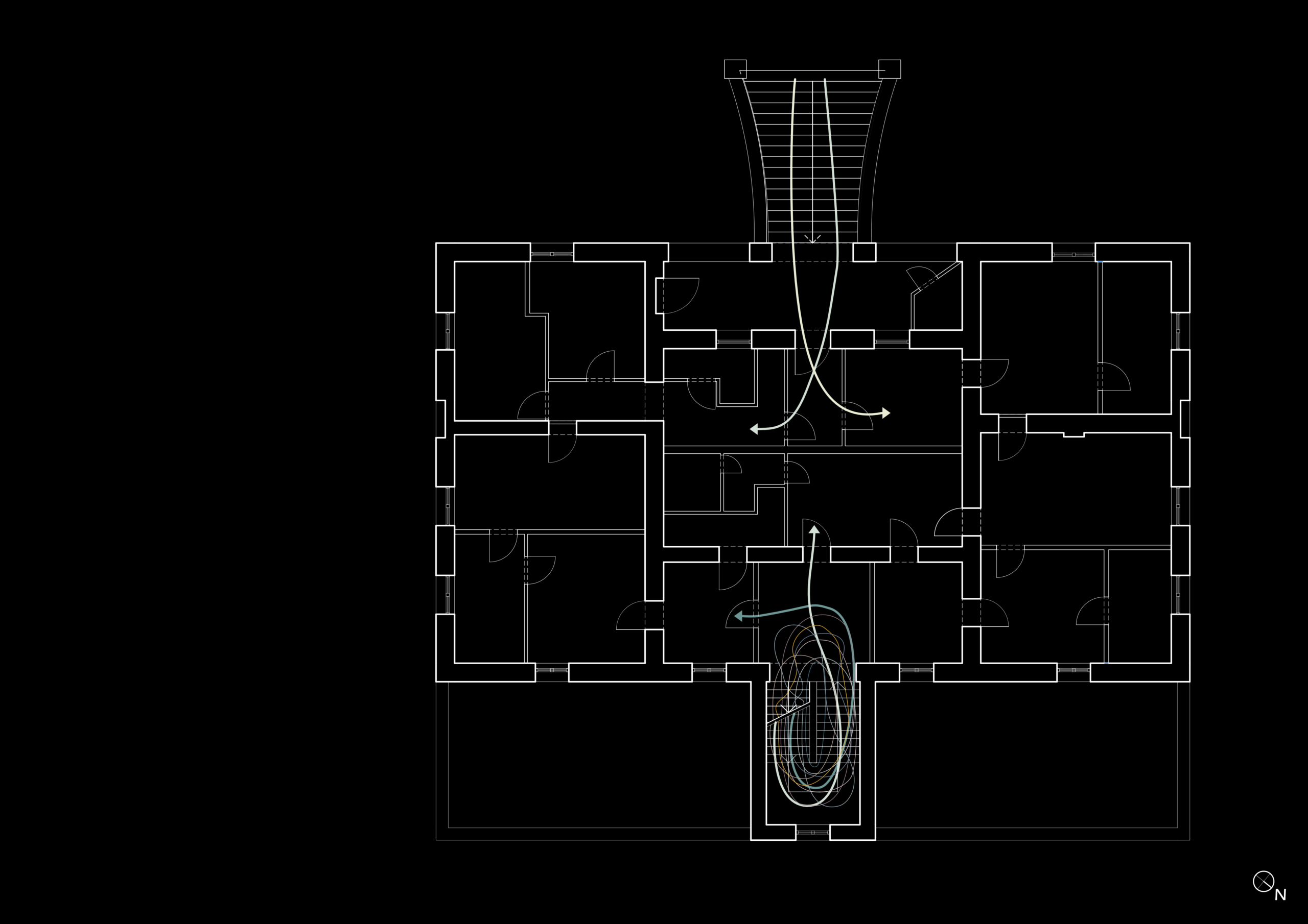 Und auch die Bewegungsabläufe innerhalb des Gebäudes haben sich an die neue Struktur angepasst. Das Treppenhaus wurde von den Bewohnern von zehn Wohneinheiten gemeinschaftlich genutzt. Innerhalb der Parteien gelangt man nun über einen Raum in den anderen – völlig ineinander verschachtelt; ein sinnvolles Flur- oder Wegesystem ist nicht zu erkennen.