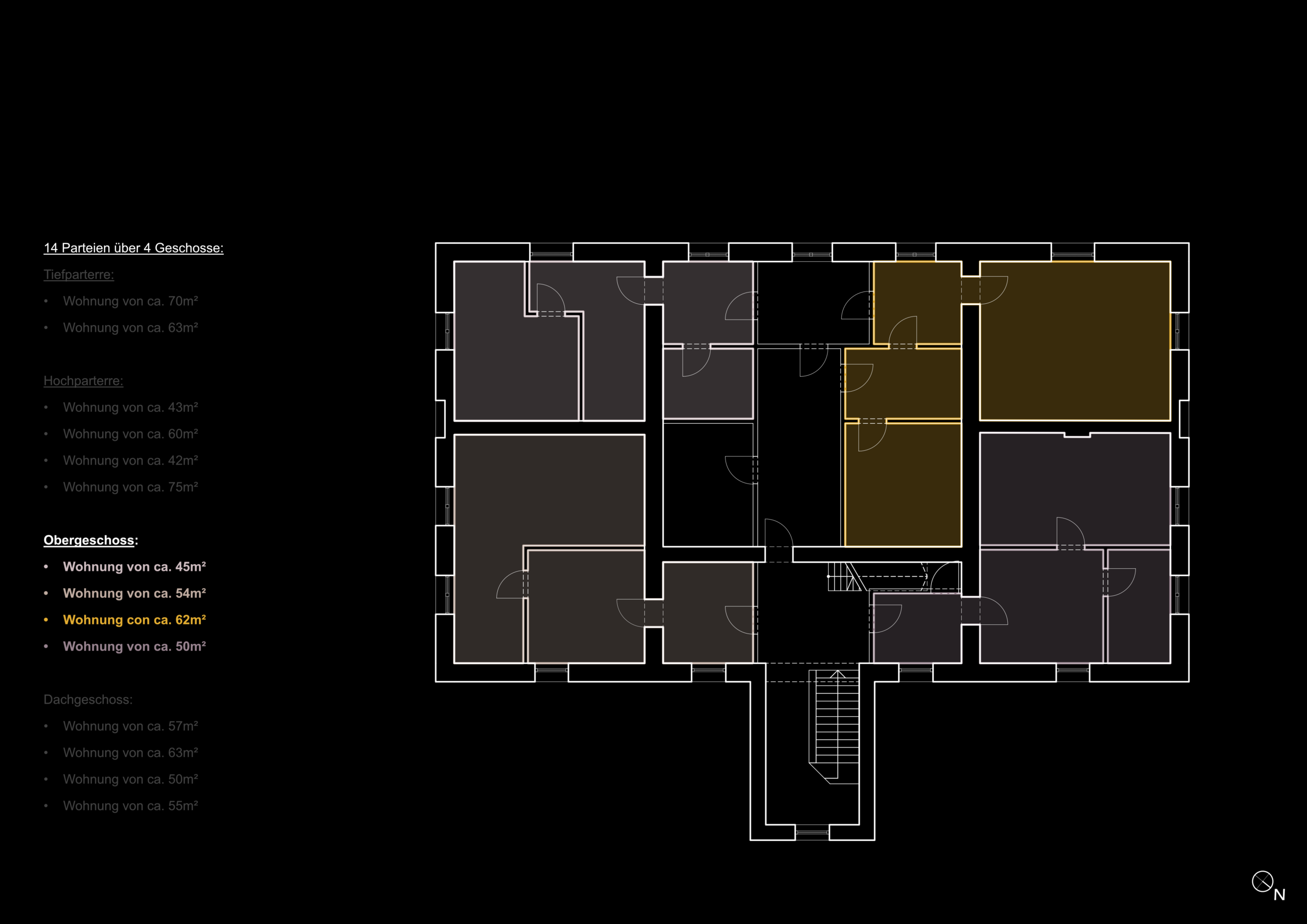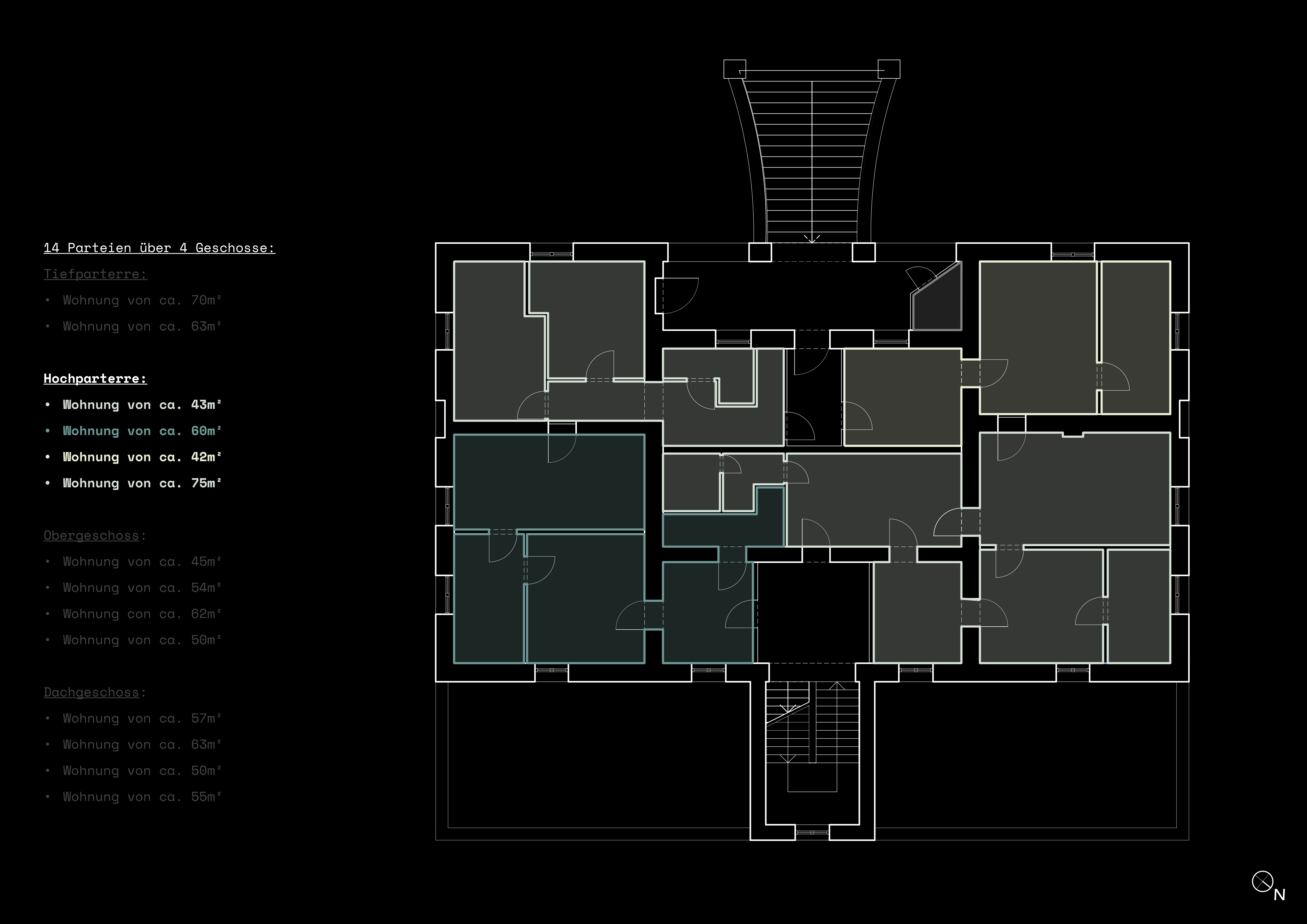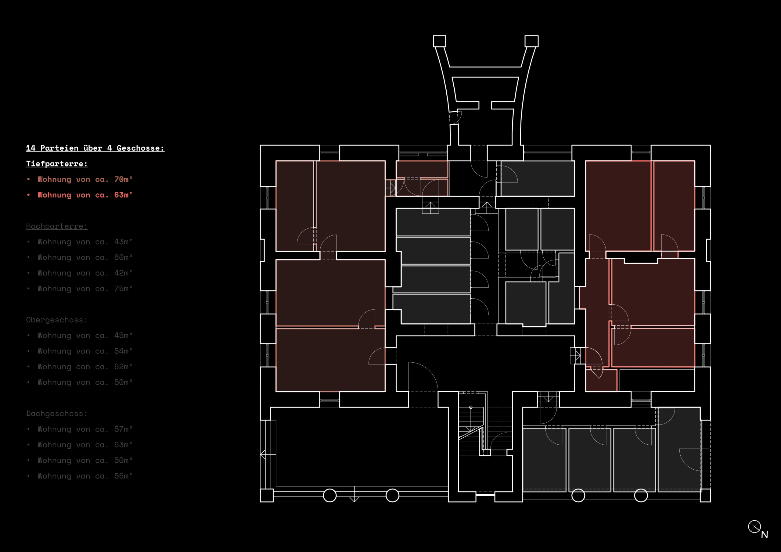 Von den vierzehn entstandenen Parteien wurden zwei über die Freitreppe – den ursprünglichen Haupteingang – erschlossen, die restlichen zwölf Parteien gelangten über die Eingangstür der Tiefparterre ins Gebäude. Das Treppenhaus wurde von zehn Wohneinheiten gemeinschaftlich genutzt.